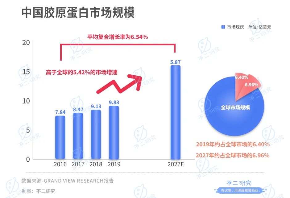 根据Grand View Research报告,中国胶原蛋白市场规模增速显著高于全球市场增速。2019年中国胶原蛋白的市场规模增长至9.83亿美元,约占全球市场的6.40%;而到2027年,中国胶原蛋白的市场规模预计将达到15.76亿美元,约占全球市场的6.96%,2016-2027年年平均复合增长率为6.54%,高于全球的5.42%的市场增速。未来国内胶原蛋白市场,或许将实现规模和产量的双向增长。
