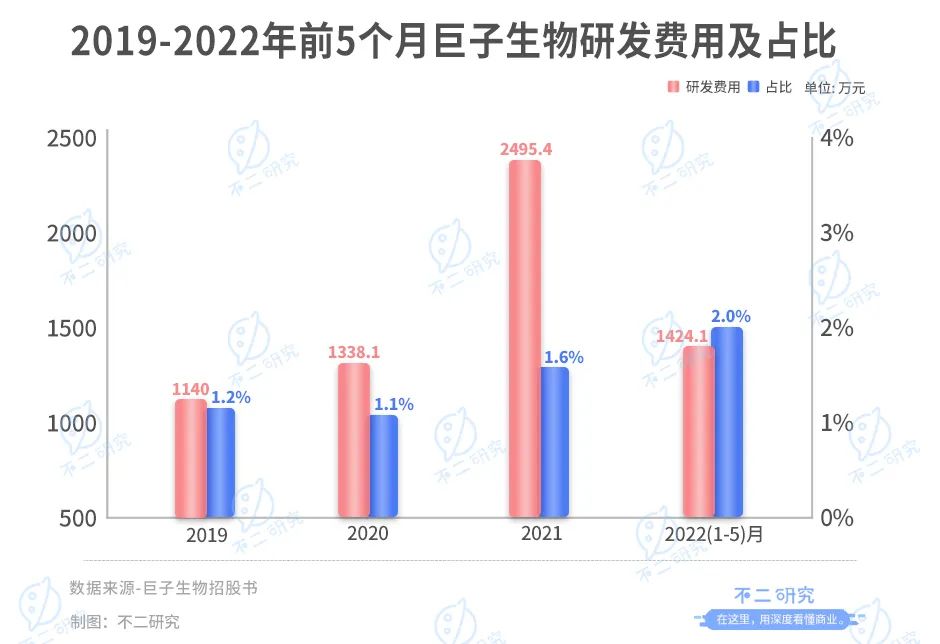 招股书显示,截至2022年5月31日,巨子生物研发团队为124人,占总人数的14.8%。2019-2021年及2022年前5个月,巨子生物研发费用分别为1140万、1338.1万、2495.4万及1424.1万,在总收入中占比分别为1.2%、1.1%、1.6%和2.0%。