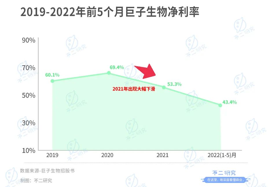 经营数据看似亮眼,但「不二研究」发现,巨子生物的业绩中仍存在不稳定因素——净利率回落。招股书显示,2019-2021年及2022年前5个月巨子生物净利率分别为60.1%、69.4%和53.3%和43.4%,2021年出现大幅下滑。