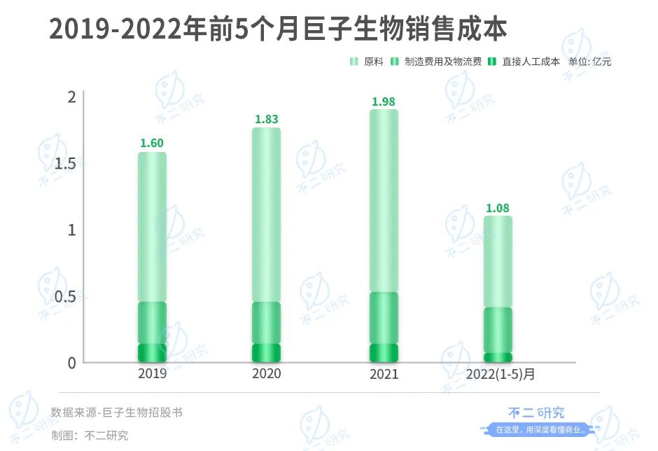 较高的毛利率来自于产业链中的主导权。在胶原蛋白领域,巨子生物覆盖了从原料端到终端产品的全链条,因此具备较强的成本控制能力。招股书显示,2019-2021年及2022年前5个月,巨子生物销售成本仅分别为1.60亿、1.83亿、1.98亿和1.08亿,包括原料采购、制造费用及物流等费用。