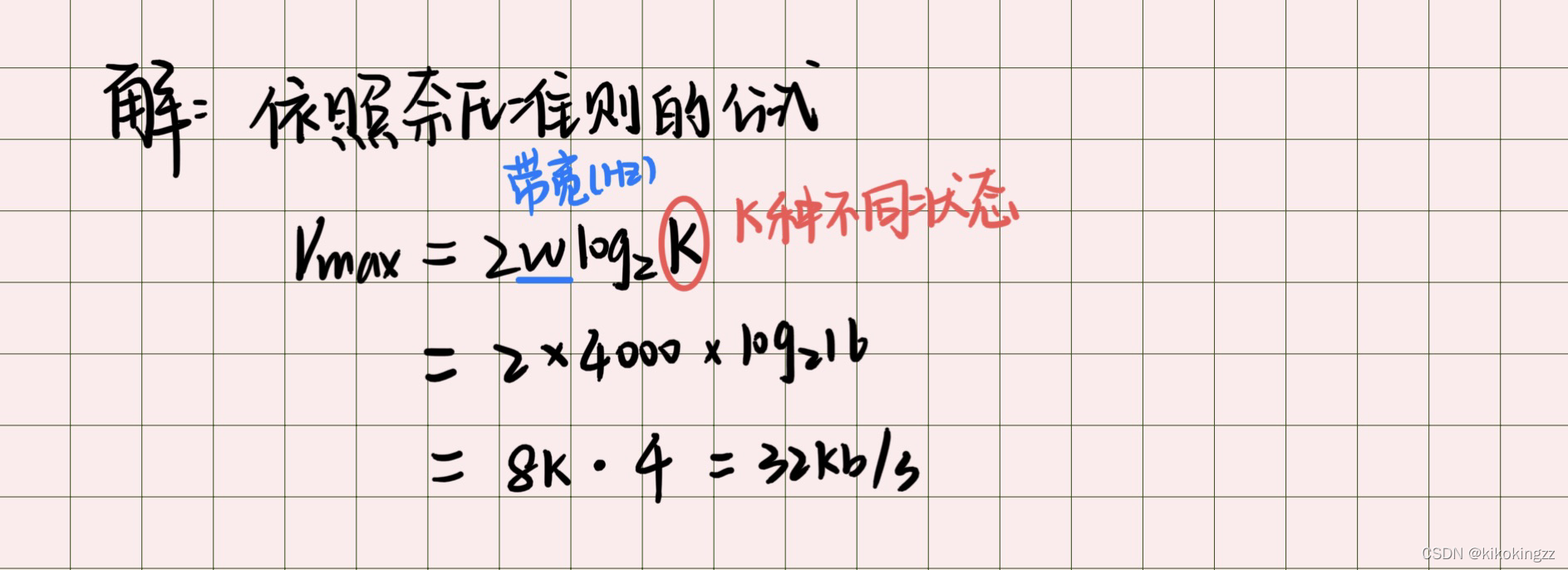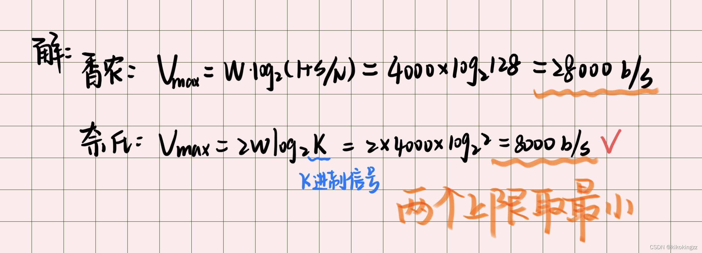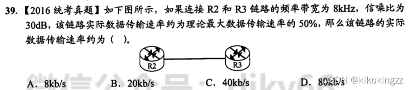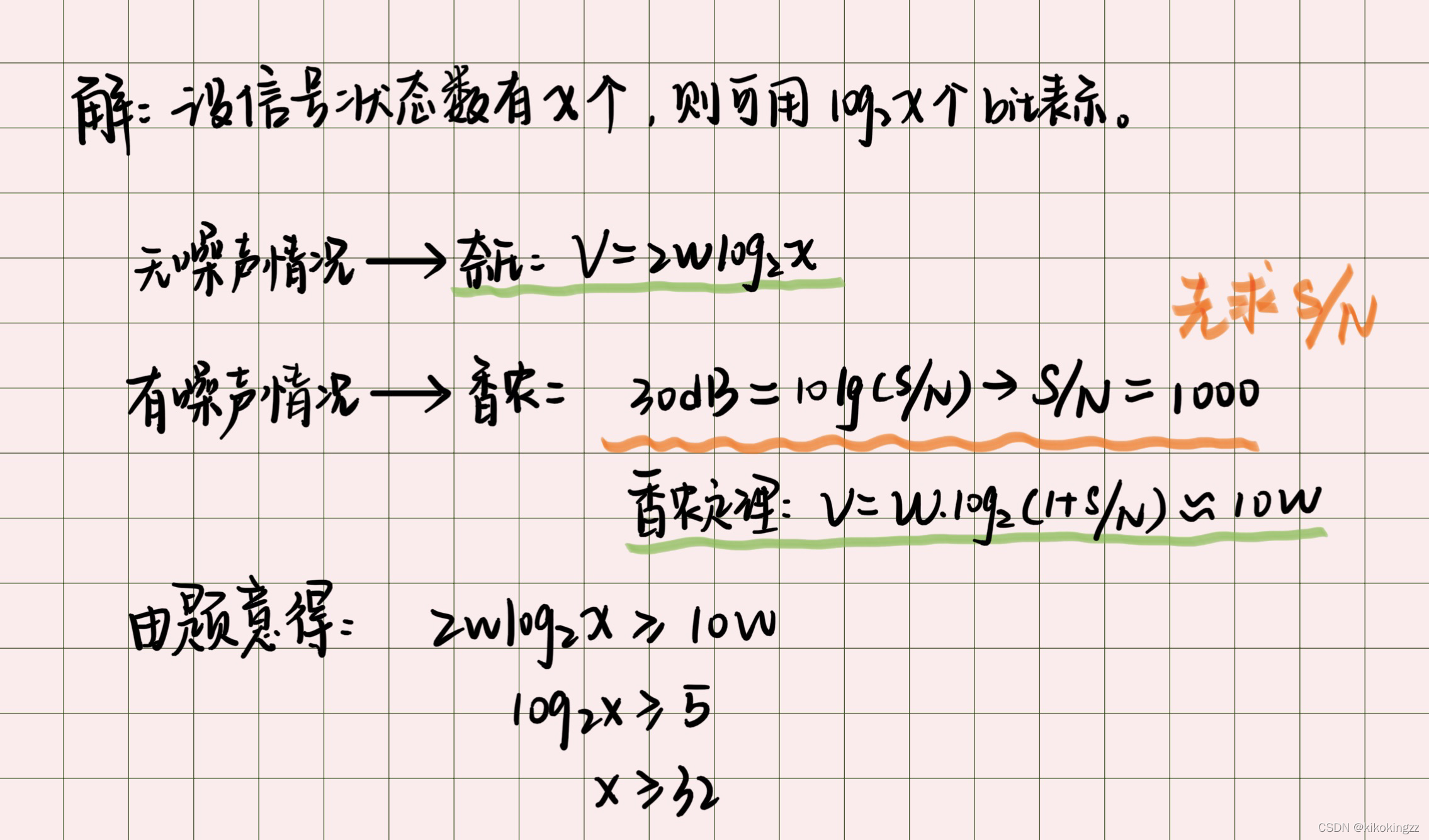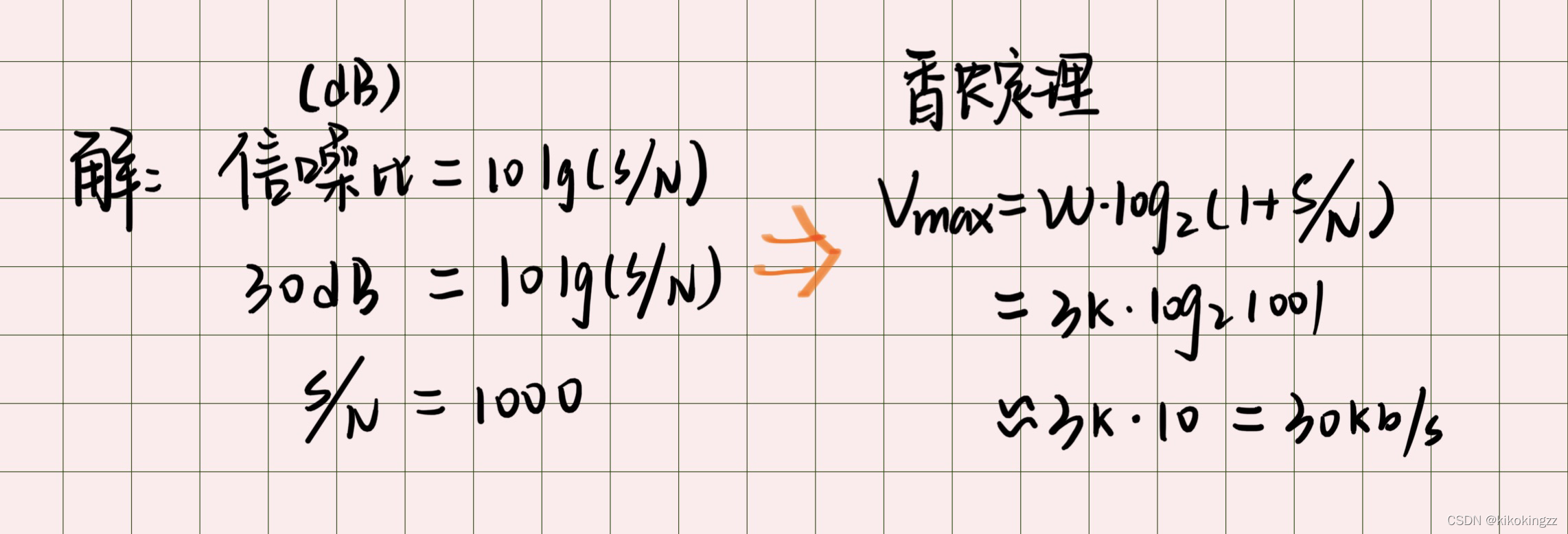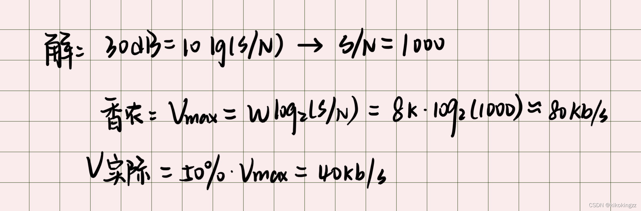 本题告知了信道带宽大小与信噪比,值得注意的是,这边给的是以dB为单位的信噪比,因此需要先用信噪比计算公式求出S/N,再通过香农定理求解: