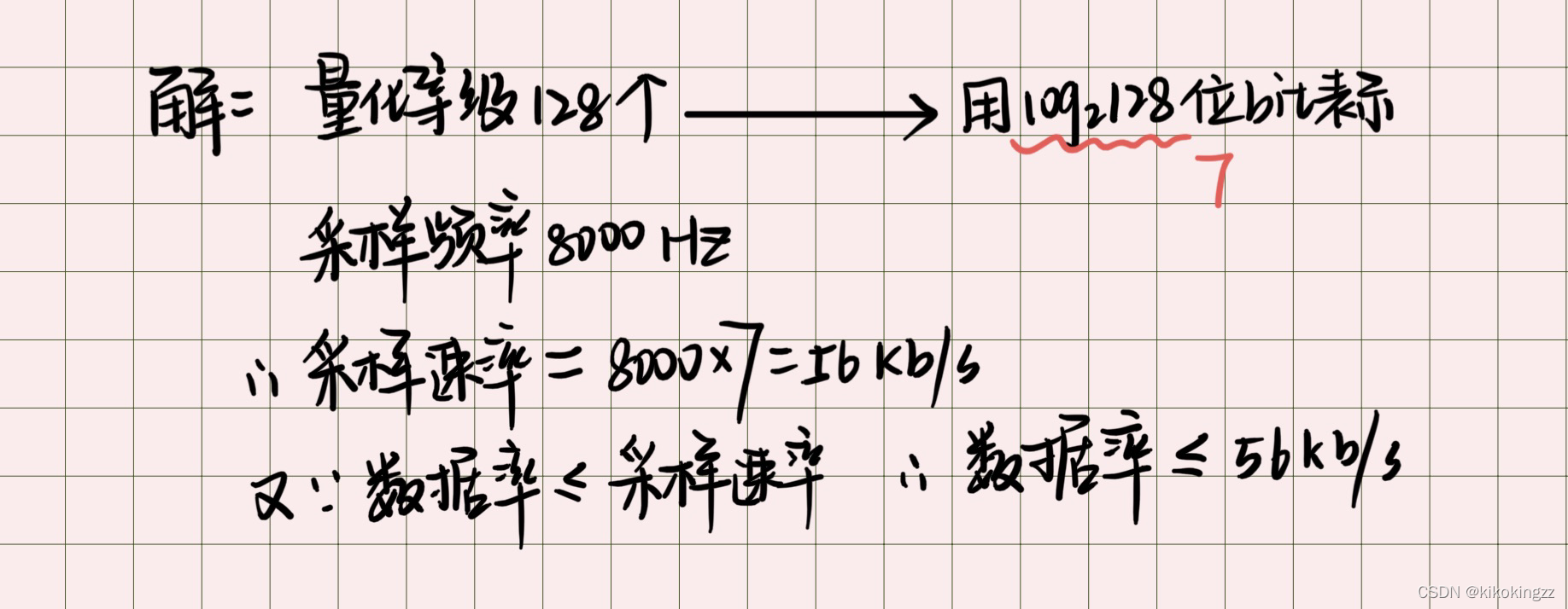 060.用PCM对语音进行数字量化,如果将声音分为128个量化级,采样频率为8000次/秒, 那么一路话音需要的数据传输速率为( )。 A.56kb/s B.64kb/s C.128kb/s D.1024kb/s🍊详细题解: