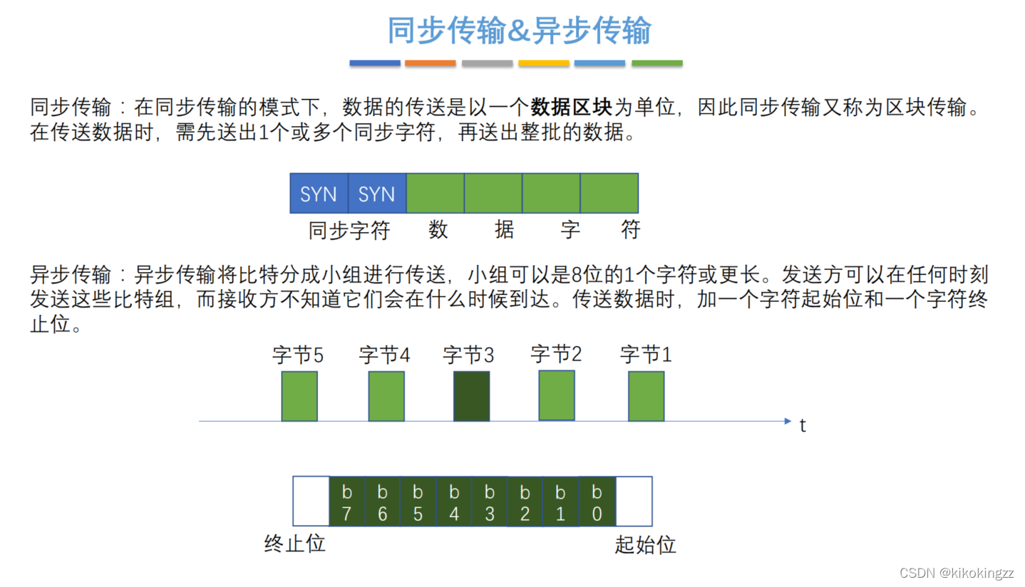 异步传输:发送方与接收方时钟无同步,每次发送一个字符;异步体现在接收双方都很任性,想什么时候发就什么时候发,接收方就会有些措手不及。