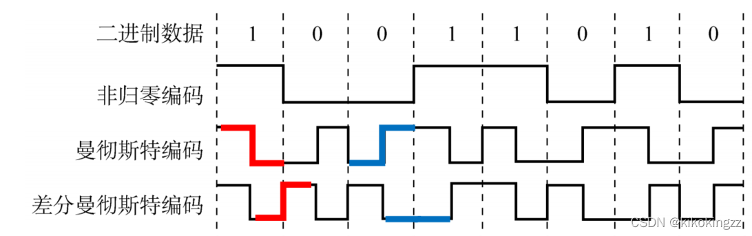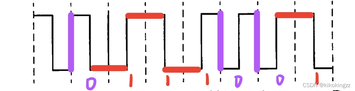 - 特点:在每个码元的中间出现电平跳变,位中间的跳变既作为时钟信号(可用于同步),又作为数据信号 它所占的频带宽度是原始基带宽度的两倍