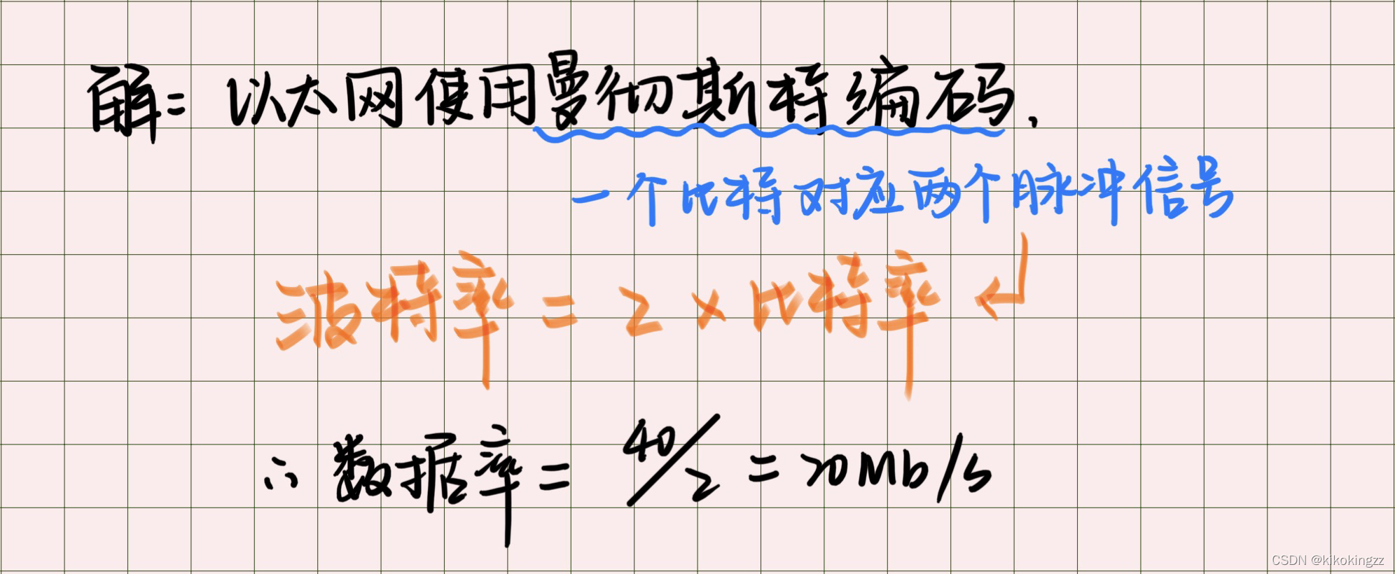 关于计算:可以看作在一个时钟周期内,只传输了1位bit,但有2个码元,即信号变化了两次(一次是中间变化,一次是信号开始处变化),因此码元传输速率(波特率)是数据传输速率(比特率)的两倍。