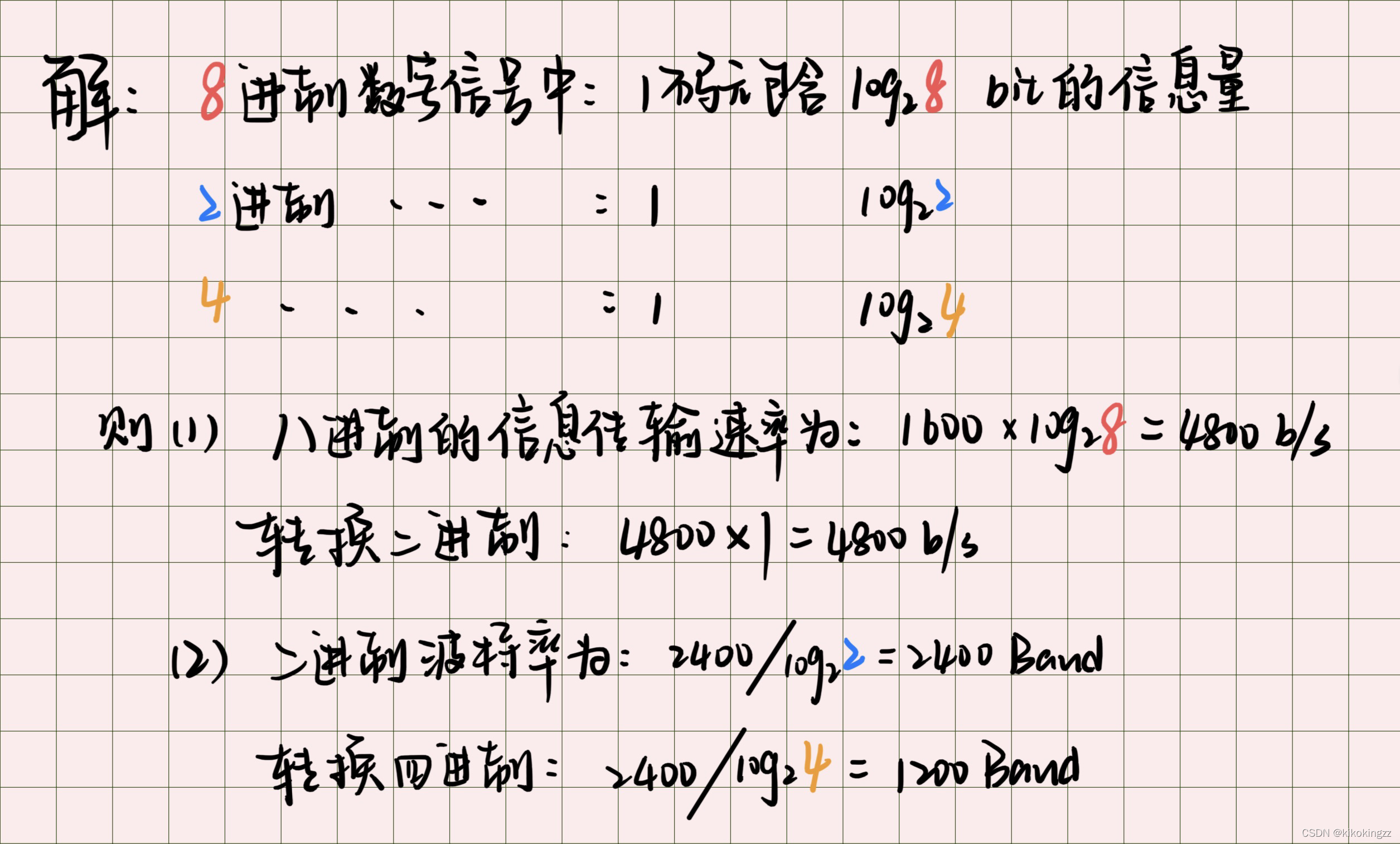 已知八进制数字信号的传输速率为1600B。试问变换成二进制数字信号时的传输速率是多少? 已知二进制数字信号的传输速率为2400b/s。试问变换成四进制数字信号时,传输速率为多少波特?