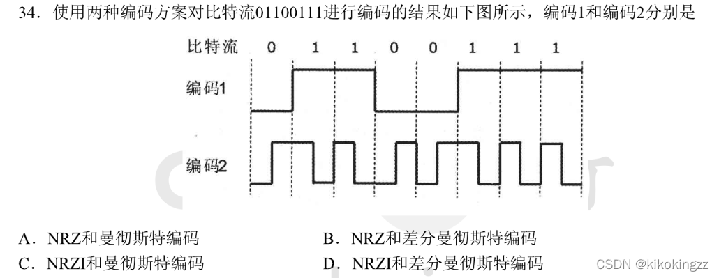 非归零编码NRZ:是最简单的串行编码技术,它用两个电压来代表两个二进制数,如高电平表示1,低电平表示0,题中编码1符合。