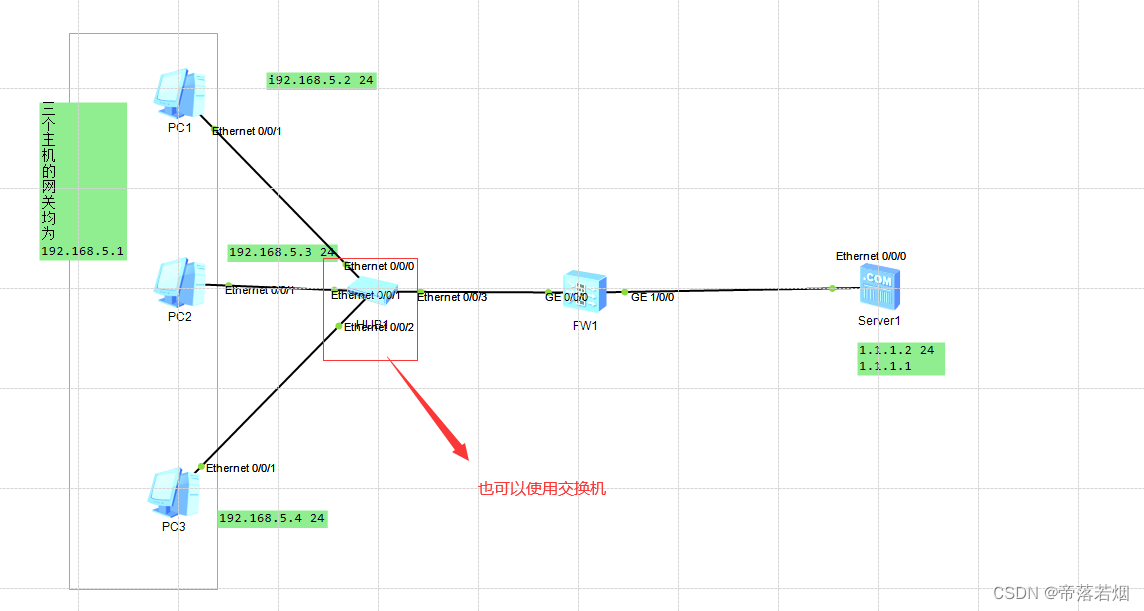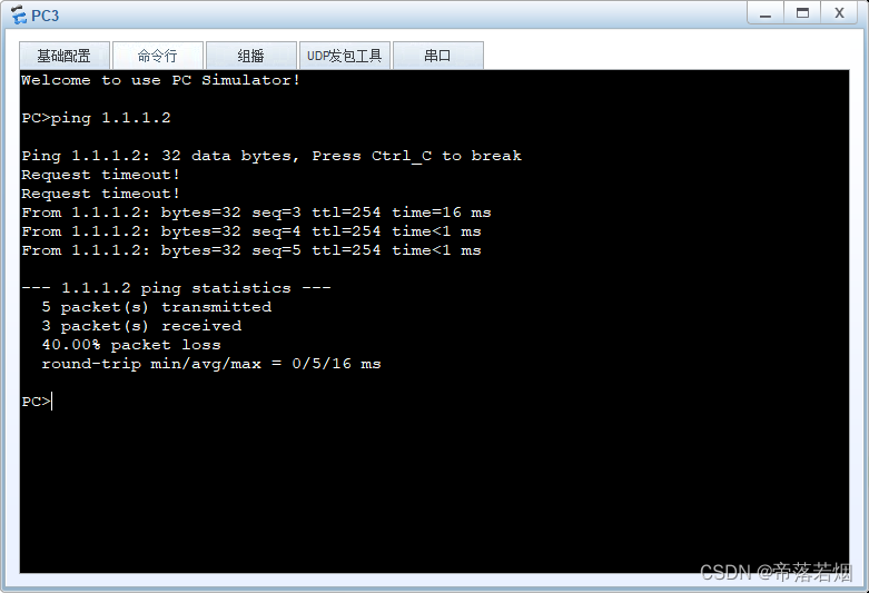 步骤七:测试,因为pc1和pc2的IP地址(192.168.5.2和192.168.5.3)被添加到不允许访问防火墙IP地址的转发策略,而pc3(192.168.5.4)没有被添加到不允许访问防火墙IP地址的转发策略,所以pc1和pc2无法ping通,pc3成功ping通目标主机,实验成功