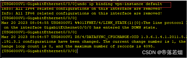 [USG6000V1-GigabitEthernet0/0/0]undo ip binding vpn-instance default