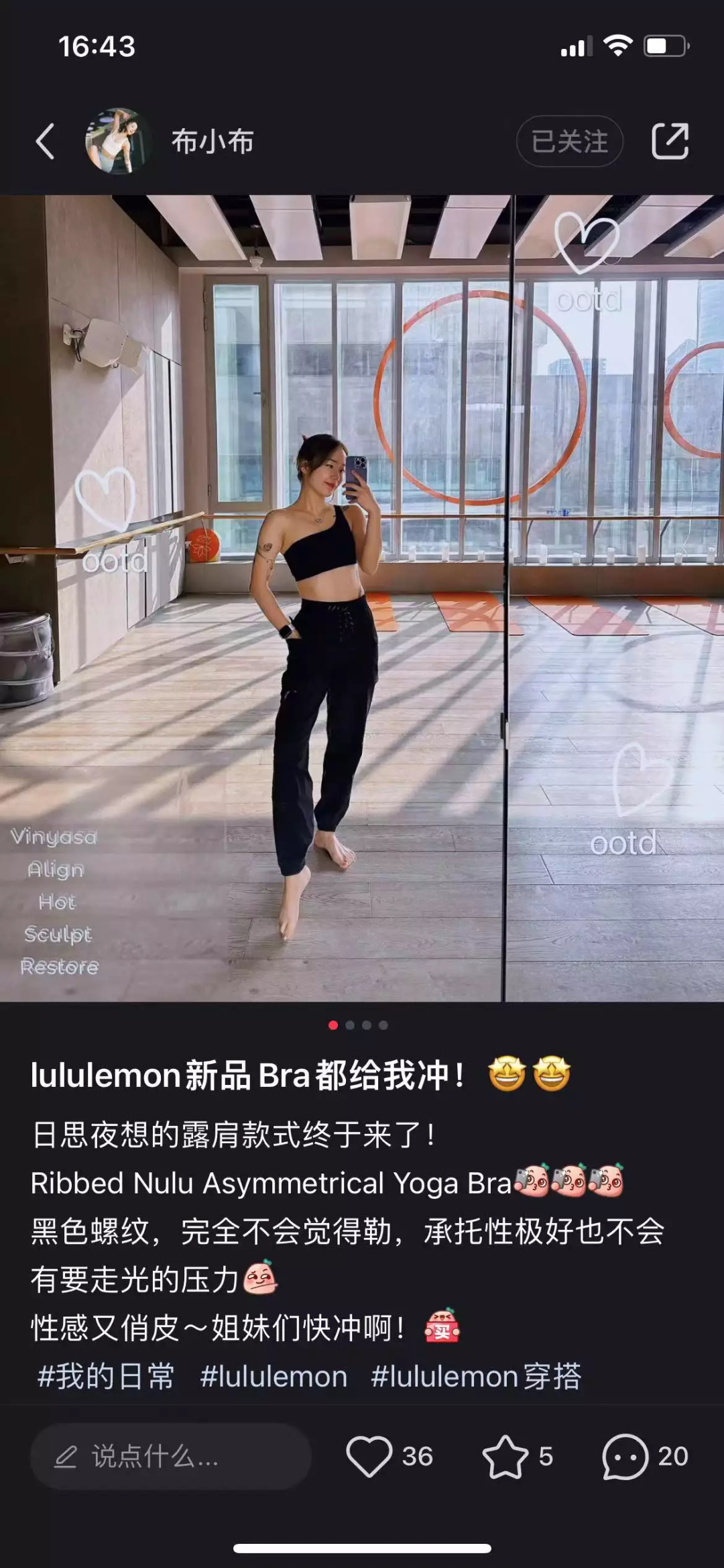 相比于社交平台的运营,小布坦言,她更喜欢把更多精力放在上课上。社交平台是她分享自己运动方式的渠道,她并不把自己定义为博主。同时小布也拒绝了很多与自己调性不符的品牌。她只想把自己喜欢的,常用的品牌分享会粉丝和会员们。