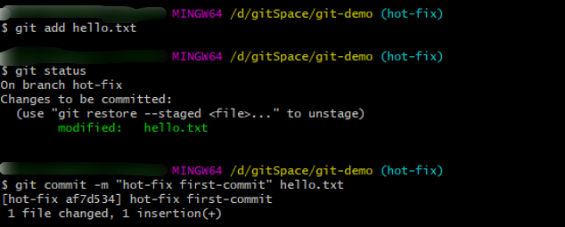 1、跳转至master分支 2、将hot-fix分支合并至master分支