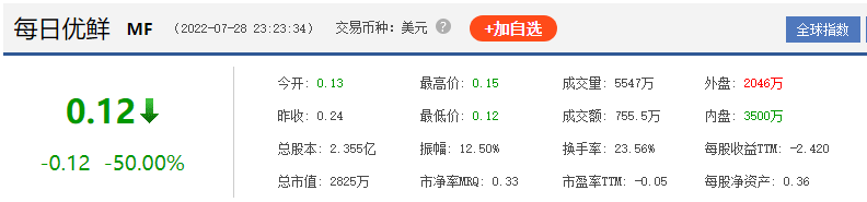 截止7月28日盘中,每日优鲜股价暴跌50%,仅剩下0.12美元/股。以2021年6月25日上市的发行价13美元/股计算,市值蒸发了99%。