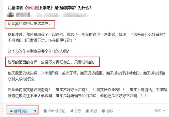 在知乎上搜“米小圈”,则出现了大量对该作品的负面评价,而且这些评价均出自家长之手。家长们纷纷反映这本书里充斥着对老师的歪曲描写——抄作业、只看成绩不管人品等等,进而质疑作品的价值观导向有问题,而这样评价中最多的有527个认同点赞,侧面说明持同样观点的家长不在少数。