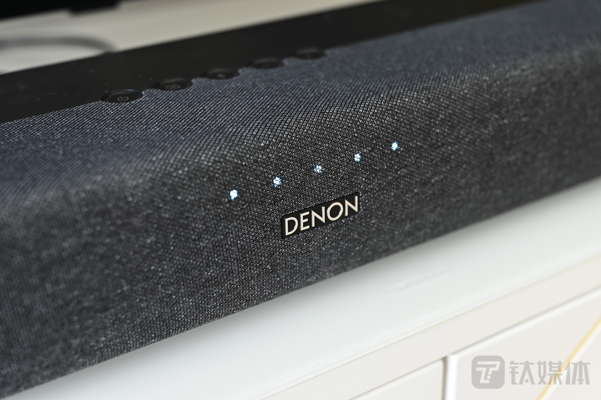 天龙S217采用黑灰颜色搭配,正面采用深灰色绒布网面料包裹,正前方一个小小的银色DENON天龙Logo,显得高端简洁。当开机后,不同模式和音量的指示灯会在Logo旁显现。