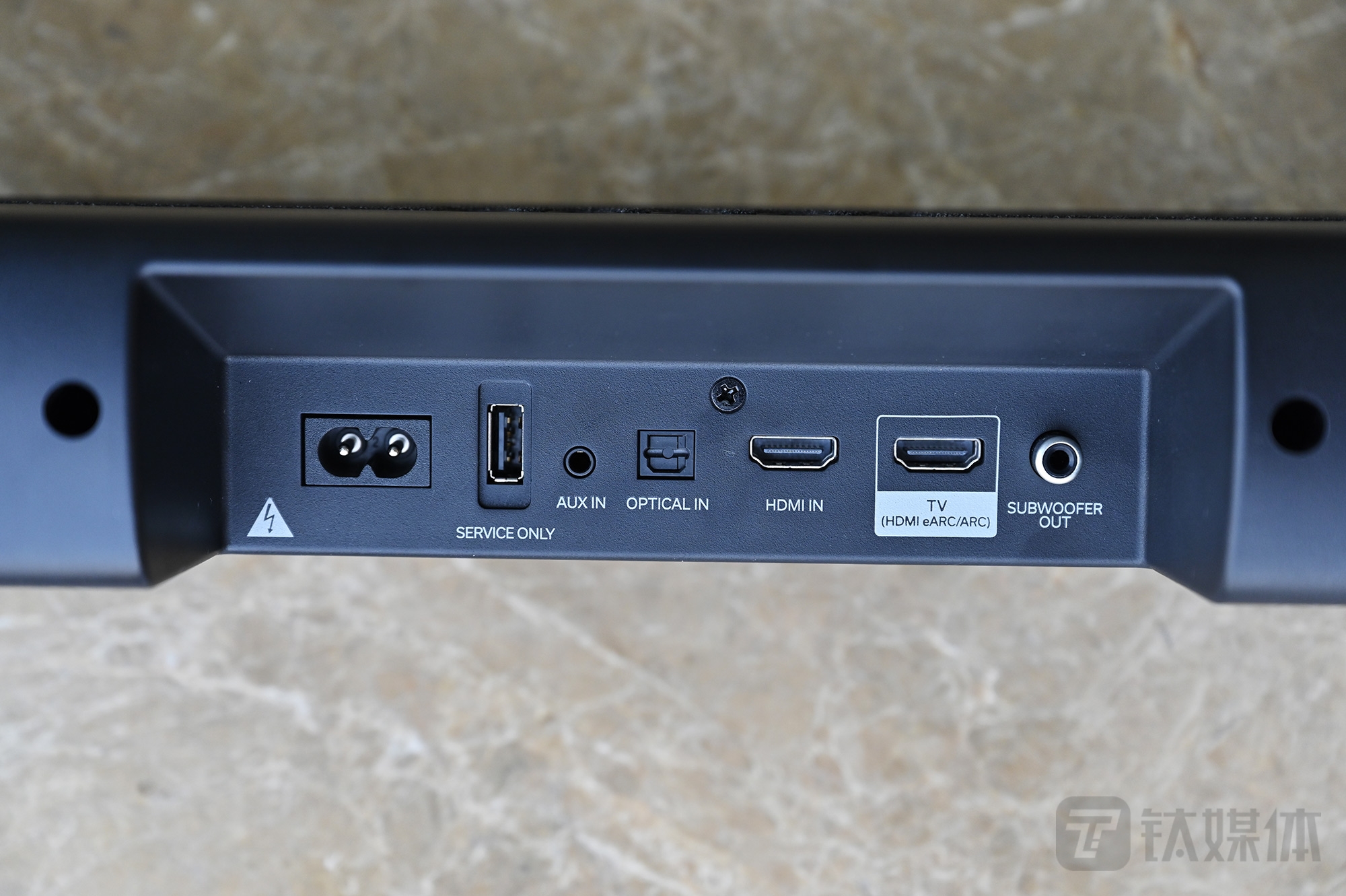 背面接口比较全,从左到右分别是电源线接口,USB接口(仅提供服务功能),AUX in,光纤接口,HDMI in接口,HDMI(eARC/ARC)接口,外接低音炮接口。值得一提的是,别看是入门级产品,如果今后想要升级外接低音炮,天龙S217也带了分离的低音炮音箱接口。而内置了电源在本体里,让外接电源线的时候就很清爽,不像有的品牌产品,还有一个比较大个头的变压器在外面不好摆放。