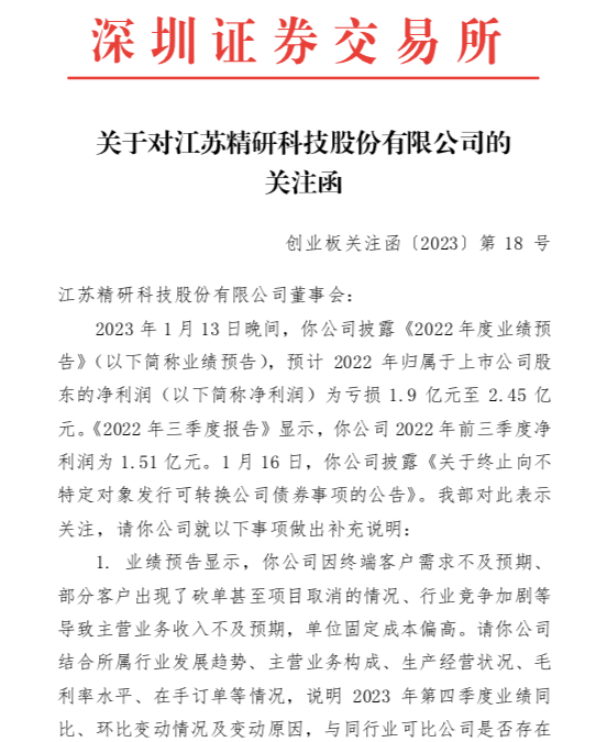 2022年前三季度盈利全年却预亏,精研科技(300709.SZ)终究没有躲过消费电子寒冬。遭遇客户砍单、砍价之后,公司火速叫停募资扩产计划。而精研科技此番遭遇重创,也受到了监管的关注。1月18日,深交所下发关注函,针对公司业绩巨亏、募资计划终止等方面提出问询。