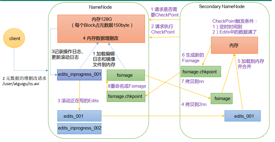 - Secondary NameNode 加载编辑日志和镜像文件到内存,并合并