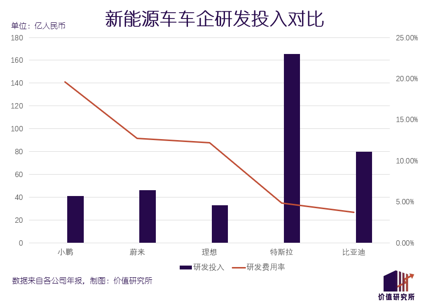 论研发投入,小鹏横向对比蔚来、理想两个老冤家,甚至比亚迪和特斯拉都毫不逊色。财报显示,上一财年小鹏研发总支出为41.14亿元,营收占比19.6%。对比之下,蔚来和理想的研发费用率分别为12.7%和12.2%,特斯拉更是只有4.8%。