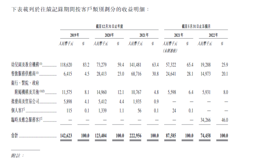 乓乓响的主要客户为当地幼儿园及教育机构。从2019年至2022年5月公司客户数量分别为222名、239名、287名及332名企业及机构客户。其中有156、156、215及171家幼儿园及教育机构客户,合计分别占公司总收益的83.2%、59.4%、63.4%及25.9%。