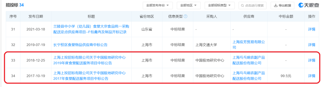 天眼查资料显示,乓乓响曾中标过中国极地研究中心2017年和2019年的食堂配送服务。