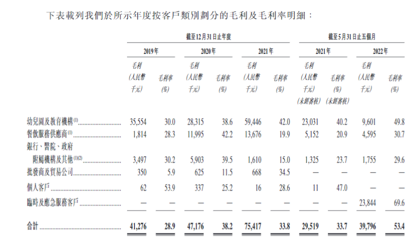 因为疫情期间临时及应急服务客户的收益增多,该部分近七成的毛利率抬高了公司2022年前5个月的毛利率。于2022年5月31日止五个月,对团购团长的销售额占临时及应急服务毛利的最大份额,约占其临时及应急服务毛利的54.3%。