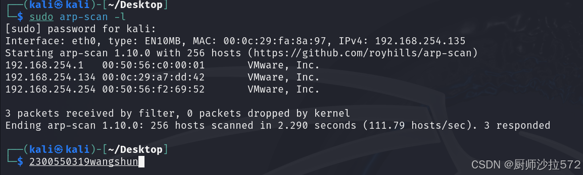 使用命令sudo arp-scan -l 扫描靶机,发现靶机ip为192.168.254.134
