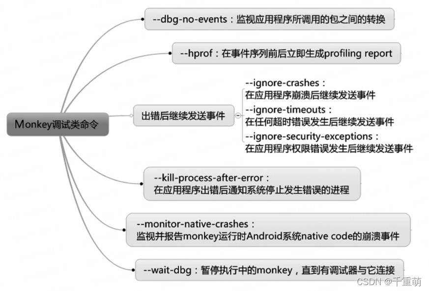 Monkey 测试时忽略应用程序崩溃(Force&Close错误),若发生奔溃,将继续发送事件给系统,直到事件计数完成(若不设置此项,在遇到奔溃时,Monkey 将停止运行)--ignore-native-crashes--ignore-native-crashesMonkey 测试时忽略本地代码导致的崩溃,若发生崩溃,将继续发送事件给系统,直到事件计数完成(若不设置此项,在遇到本地代码导致的奔溃时,Monkey 将停止运行)--monitor-native-crashes--monitor-native-crashes监视崩溃时的本地代码--dbg-no-events--dbg-no-events
