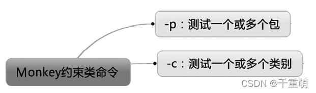 - {日志路径}> d:\mylog.logMonkey 测试日志记录文件约束类命令-p + {被测应用包名}-p com.leiting.sdk.test2只针对指定包名进行测试-c + {一个或多个类别名}
