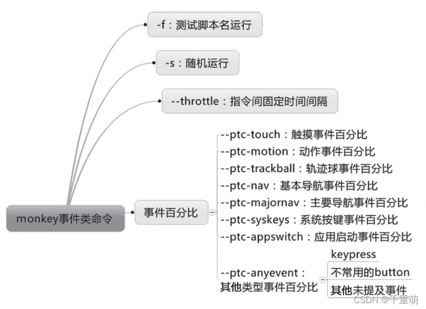 --wait-dbg--wait-dbg在设置此项后,将暂停执行中的monkey,直到有调试器与它连接。事件类命令-s {数字}-s 100随机数生成器的 seed 值,如果使用相同的 seed 值再次运行 Monkey,将生成相同的事件序列(也就是说,重复执行刚才的随机操作)--throttle + {毫秒单位时间}--throttle 100事件之间插入的固定延迟,单位毫秒。通过这个选项可以减缓Monkey的执行速度。如果不指定,Monkey将尽可能快的产生并执行事件--pct-touch + {数字}--pct-touch 30触摸事件占比,即整个测试过程中,触摸事件占 30%(指在某一位置的一个 down-up 事件,如:点击)--pct-montion + {数字}--pct-montion 30动作事件占比,即整个测试过程中,动作事件占 30%(指从某一位置接下(即down事件)后经过一系列伪随机事件后弹出(即up事件))--pct-trackball + {数字}--pct-trackball 30轨迹事件占比(指随机移动事件,以及偶尔跟随在移动事件后面的点击事件)--pct-nav + {数字}--pct-nav 30基本导航事件占比(指来自方向输入设备的上、下、左、右事件)--pct-majornav + {数字}--pct-majornav 30主要导航事件占比(指引发图形界面的一些动作,如键盘中间按键、返回按键、菜单按键等)--pct-syskeys + {数字}--pct-syskeys 30系统按键事件占比(指仅供系统使用的保留按键,如HOME键、BACK键、拨号键、挂断键、音量键等)--pct-appswtich + {数字}--pct-appswtich 30应用启动事件占比(指打开应用,通过调用 startActivity() 方法最大限度地开启该 package下的所有应用)--pct-anyevent + {数字}--pct-anyevent 30其他事件占比(指上文中未涉及的所有其他事件,如 keypress、不常用的 button 等)