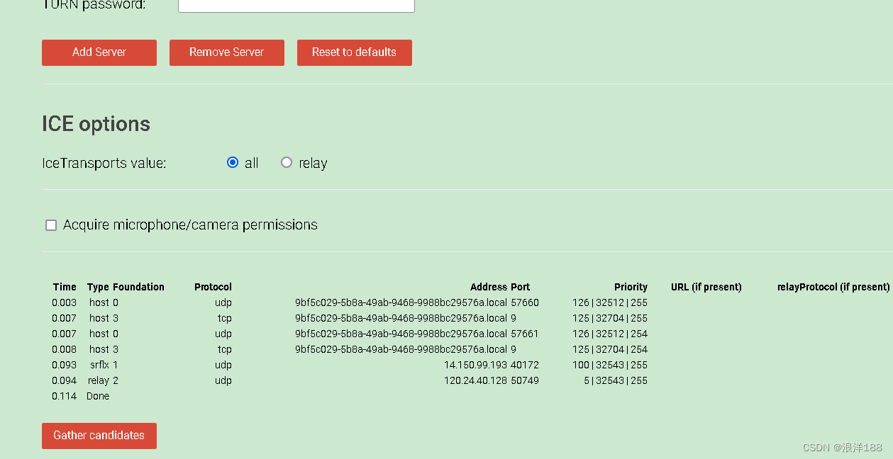 可以看到有服务器所在公网地址返回的信息,能通过turn服务器中转,有relay地址回来说明你的ip穿透成功。