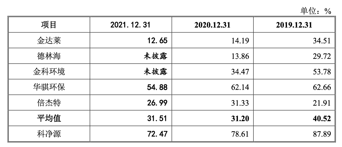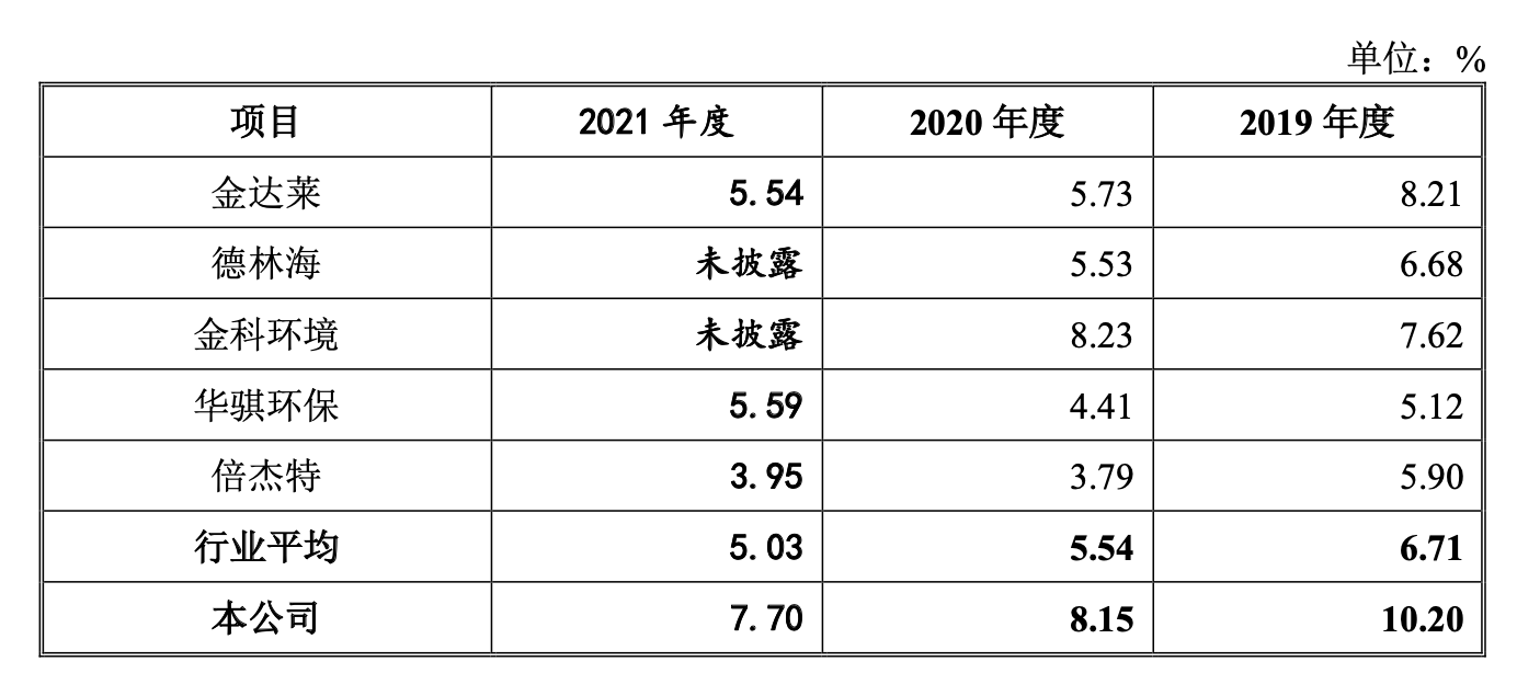 其实,科净源的管理费用一直处于较高益。2019至2021年分别为3,170.51万元、2,618.86万元、3,700.13万元,占营收比例为10.20%、8.15%和7.70%。2021年管理费用较上年增长41.29%,管理费用所占营收比高于同行业可比上市公司平均值(见下图)。