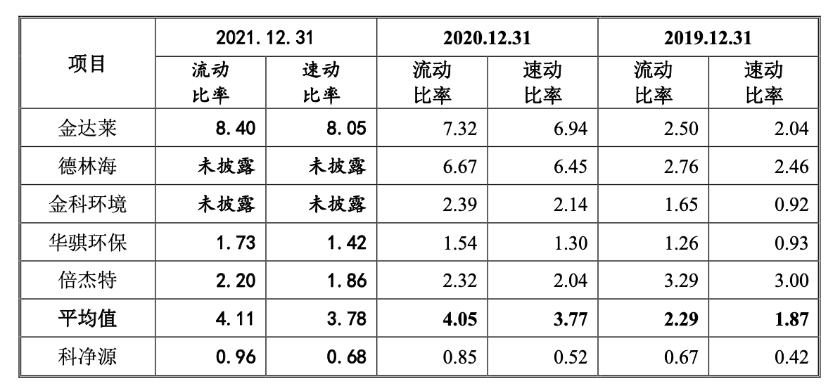 科净源对此表示,因公司水处理产品和水环境综合治理业务处于快速扩张期,对营运资金的需求较高,公司通过增加预收款及应付账款来缓解资金压力,导致公司流动负债规模相对较高,流动比率和速动比率相对较低,同时资产负债率相对较高。