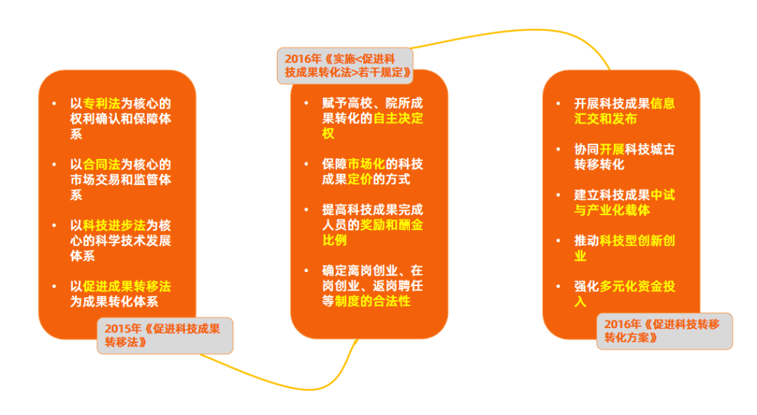 随后,国家也发布了一批配套文件,从国家战略层面、法律法规层面、行业指导层面以及地方管理层面发布了一整套促进成果科技成果转化的文件,目的是激发我国的科技创新的团队的活力和积极性。