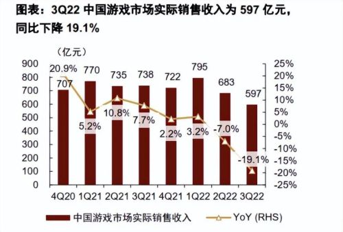 ▲2022年第三季度,中国游戏市场实际销售收入同比下降19.1%。