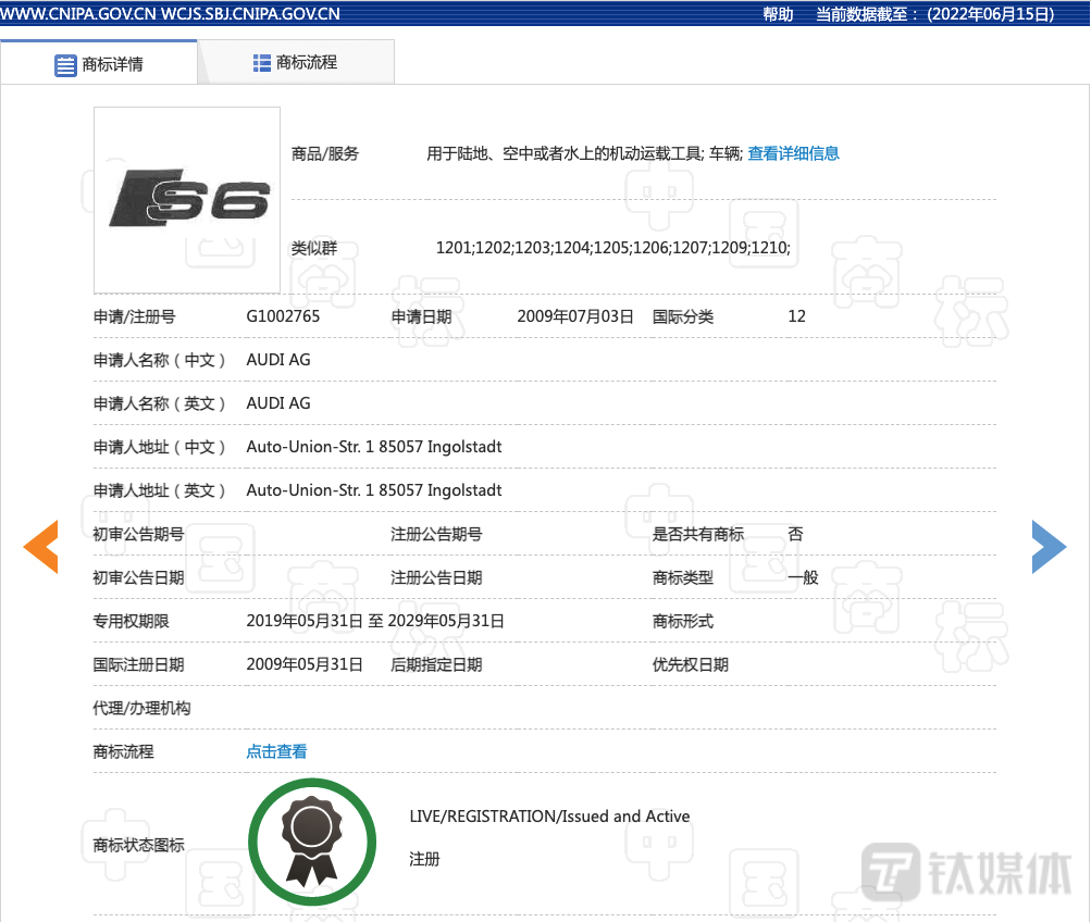奥迪S6的商标注册分类中包括第12类。(图片来源:国家知识产权局商标局官方网站)