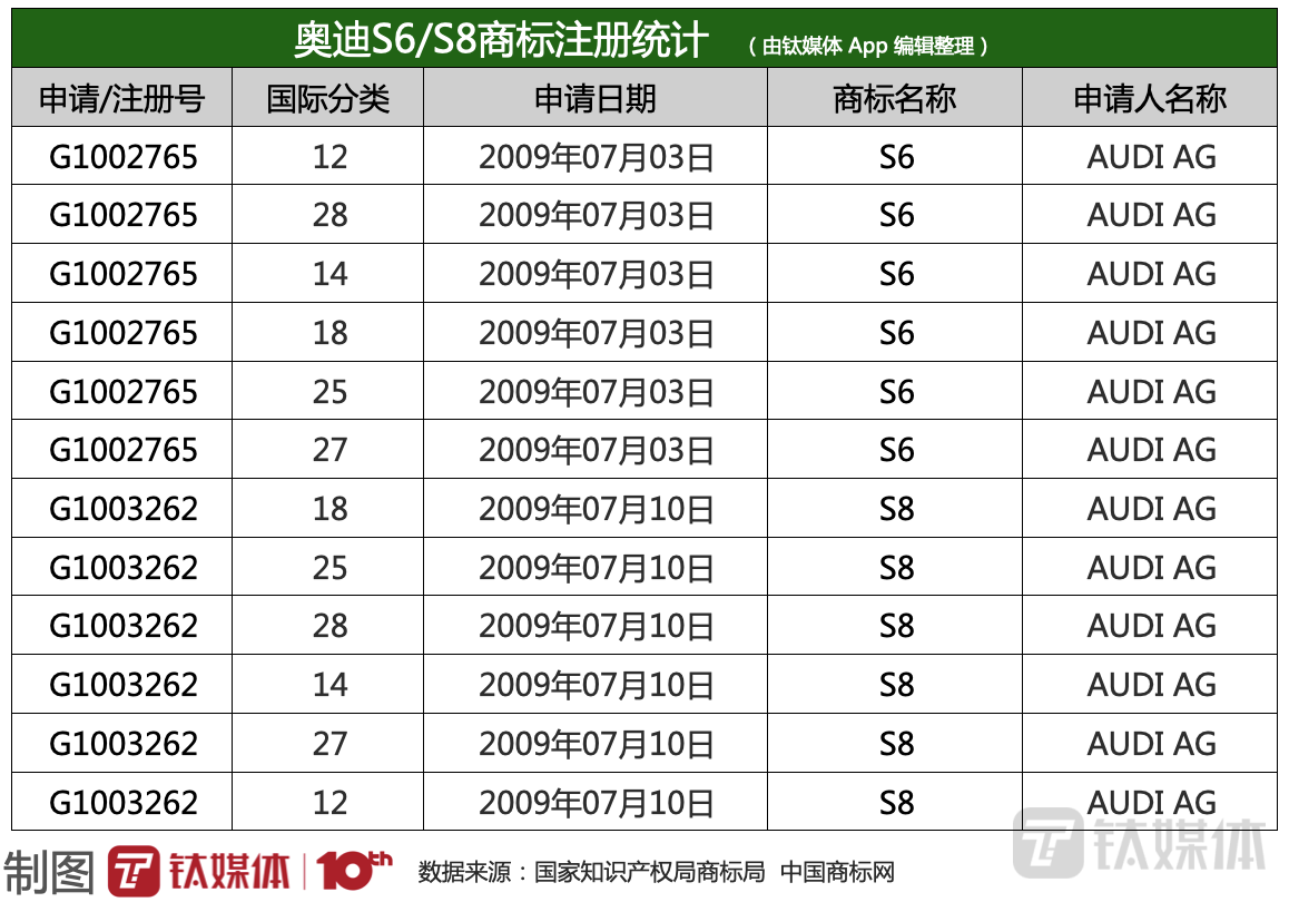 钛媒体APP在国家知识产权局商标局官方网站进行了查询。AUDI AG共持有12项与S6、S8相关的商标,涵盖了商标国际分类中的12、14、18、25、25、27、28等多个类目。
