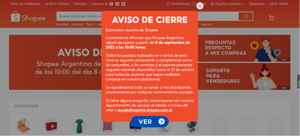 Shopee阿根廷站也贴出了通知,表示Shopee Argentina于9月8日上午10:00正式停止运营。平台将继续为已购产品的用户提供运输、售后服务和支持,直到10月31日。