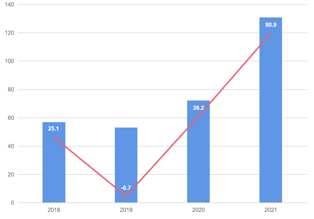 2021年,科沃斯营收130.9亿,同比增长80.9%,其中添可收入51.4亿,同比大涨308%,带动整体营收增长。