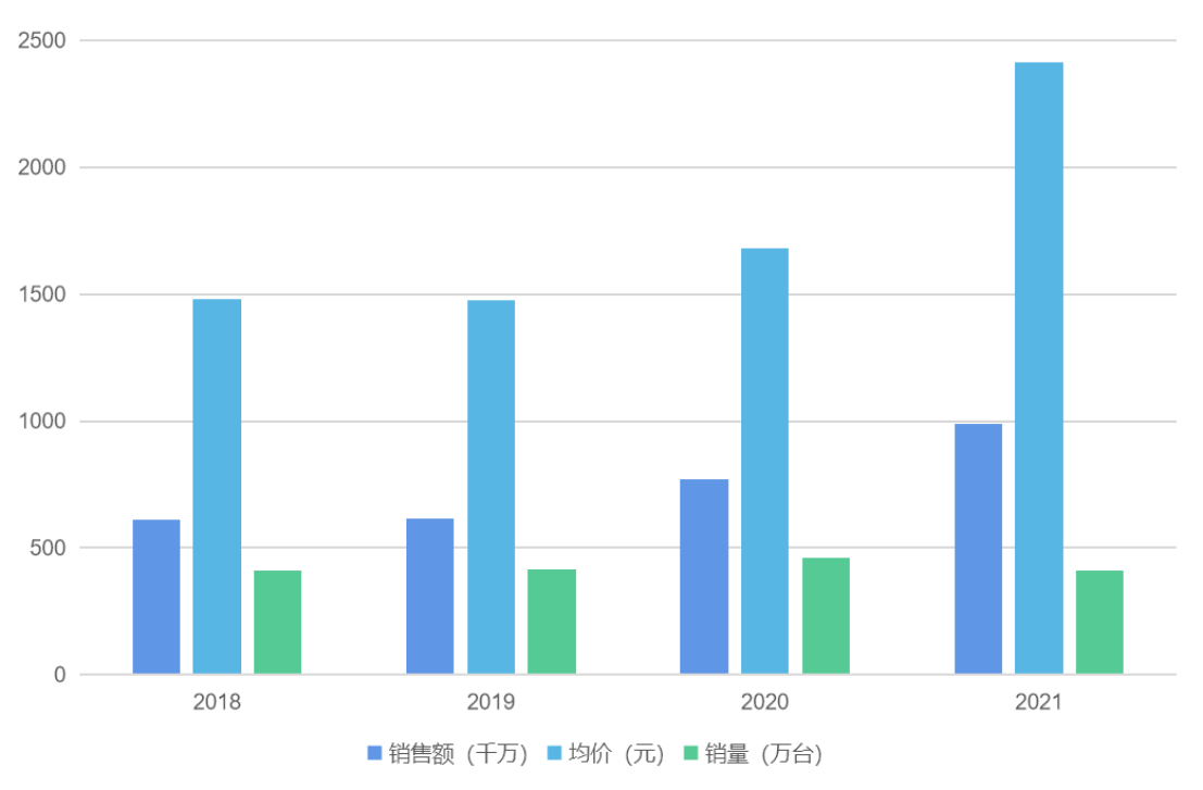 此外,价格上涨推动主力消费区间向上移动。2021年国内3500元以上价格区间市场份额52%,比去年同期提升25.1个百分点。