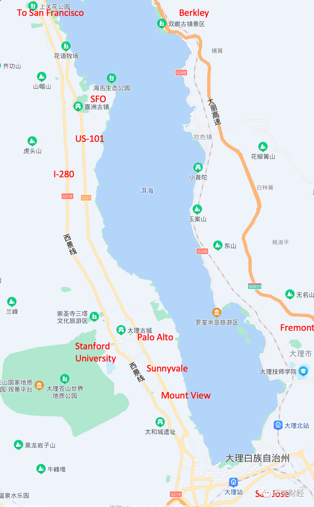 同时,这些数字游民们还将大理称作“Dailifornia”,即“大理福尼亚”,与美国加利福尼亚州谐音。原因也很简单,从地里形态上,大理和旧金山湾区几乎一模一样。比如洱海是小号的旧金山湾,大理大学位置和斯坦福大学位置恰好相同;大理古城在Palo Alto处;苍山和旧金山湾区山脉位置也几乎吻合……