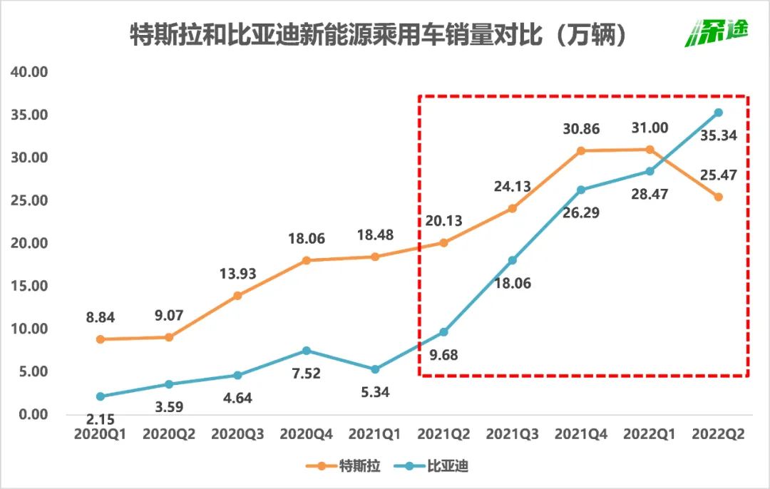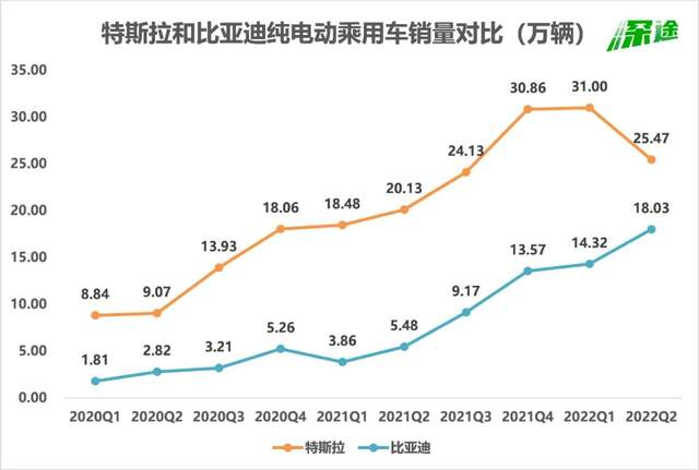 从这张图中可以看到,过去连续8个季度以来,特斯拉的季度交付量一直领先比亚迪,今年二季度是比亚迪首次反超。