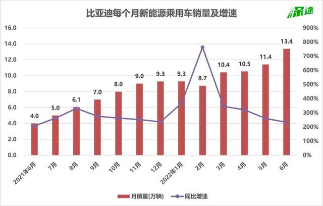 在秦PLUS DM-i之后,比亚迪宋、唐、元、海豚接棒,纷纷迈入月销过万阵营,宋甚至超过3万辆。在多款车型的助力下,比亚迪新能源车的整体月销量,以每个月净增1万辆的速度膨胀,然后在今年3月突破10万辆,5月突破11万辆,6月突破13万辆。