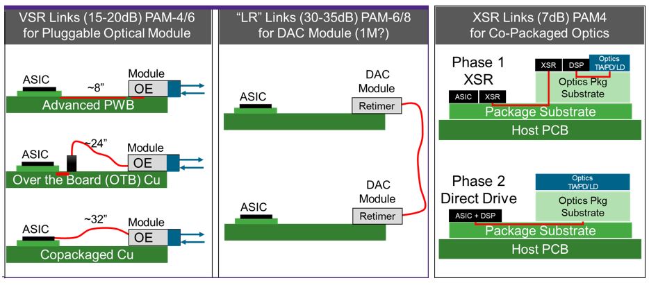 至于PHY,开发者一直使用的是铜互连的长距离连接方式,但对于具有数百个PHY通道的大型SoC,这种连接方式逐渐超出物理定律的极限,于是很多开发者开始转向采用可插拔光学模块的Very Short Reach(VSR)PHY。随着共封装光学日益普及,Extra Short Reach(XSR)PHY以及未来的通用芯片高速互连(UCIe)PHY日后可能会更加受欢迎,因为它们可实现将光子芯片放在非常靠近主机芯片的地方,甚至是放在同一个封装基板上。