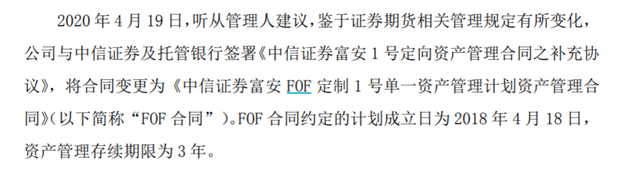 在前四期产品运作良好的前提下,2020年4月19日,富安娜方面“听从管理人建议”,鉴于“证券期货相关管理规定有所变化”,与中信证券签订了补充协议,将原本的理财合同变更为FOF合同。