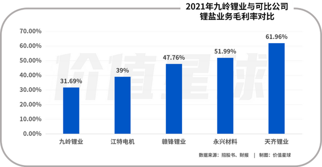 从锂盐毛利率来看,2021年度,碳酸锂等原料价格的飞涨让全行业从中受益。2021年,天齐锂业的毛利率为61.96%、赣锋锂业为47.76%,九岭锂业只有31.69%,并不具备明显优势。
