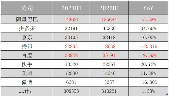 但如果我们更细致的截取互联网广告行业中,最头部几家企业的数据,会发现上述结论并不正确。并且显而易见,互联网广告行业中正在发生着一些重要的变化,那就是其内部结构调整。