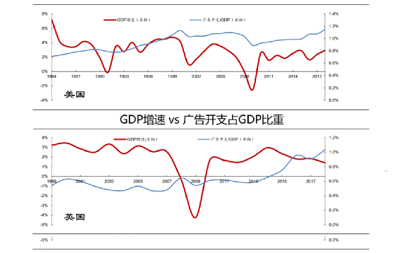 因为较快的经济增速意味着增量市场,这种条件主导下的商品销售会更容易。而GDP增速下行,竞争愈发激烈,存量市场的争夺中销售费用的开支反而会变大。咨询机构给出的英美两国GDP增速,和广告开支占GDP比重的走势,证明了上述观点。