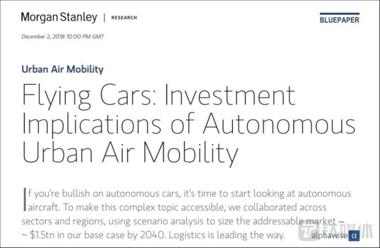 事实上,此前有不少机构对飞行汽车作出了乐观预判。摩根士丹利(Morgan Stanley)在 2018 年 12 月初发布了一份长达 85 页的报告,指出到 2030 年飞行汽车行业在全球将形成 3000 亿美元的市场规模,德勤也曾乐观预估 2030 年全球的飞行汽车将达到 23000 辆。
