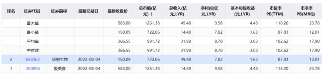 同为申银万国三级行业的医美耗材类,爱美客营收不及华熙生物,市值却远高于华熙生物。此外,爱美客虽营收不及华熙生物,净利润却高于后者。