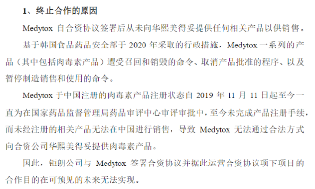 对于终止合作的原因主要有两个,一方面是Medytox公司的一系列产品在韩国被召回和销毁;另一方面为相关产品在国内的审批,自2019年11月至今未完成产品注册手续。